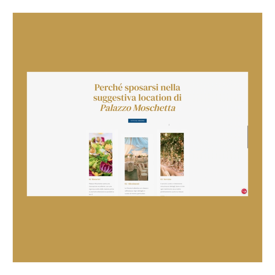 Per Palazzo Moschetta ci siamo occupati della ricostruzione del logo, tratto da un’effigie del 1616. Ci siamo attenuti quanto più possibile alla struttura originale dell’araldo ricreandolo e vettorializzando ogni componente interna. Abbiamo realizzato il sito, partendo dal design, e cercando di trasmettere, tramite foto, la natura storica del Palazzo, situato a Moschetta, Locri. Il design del sito è stato studiato per garantire maggiore immersione visiva all’utente, con foto, animazioni e testi eleganti che appaiono nel momento in cui l’utente visita le varie pagine e sezioni.