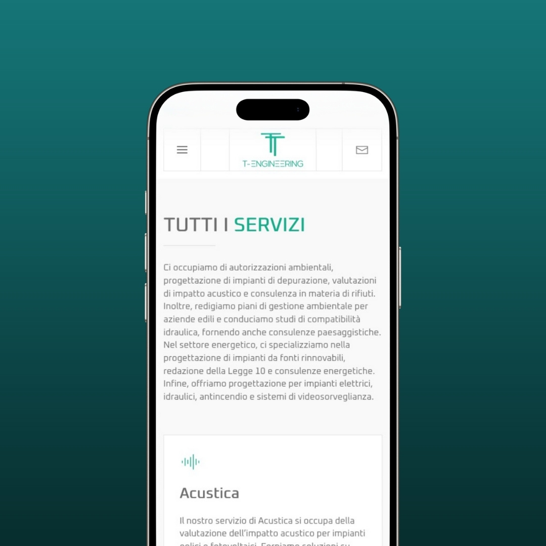 Per T-Engineering abbiamo realizzato un sito responsive e intuitivo, progettato per valorizzare l’ampia gamma di servizi offerti: acustica, autorizzazioni ambientali, depurazione, energie rinnovabili, impiantistica e direzione lavori. Il layout sobrio e moderno facilita la fruizione dei contenuti, trasmettendo competenza e affidabilità. Ogni sezione è organizzata in modo chiaro, rafforzando l’identità del brand e supportando una comunicazione efficace verso clienti e partner.